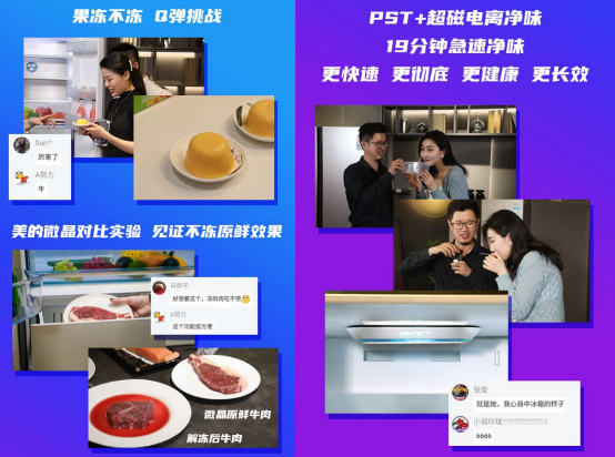 在4月30日美的冰箱开展的以“亿元消费券,五一狂欢购”为主题的直播中,美的冰箱跨界联手志邦家居、飞鹤奶粉、亨氏三大知名品牌,5小时巅峰让价、精选好物0元抢等钜惠活动吸引了万千观众的关注。除此之外,美的冰箱人气主播天团首度同台PK百万粉丝达人的全新直播形式更是吸睛力十足,引得观众纷纷发表评论刷爆直播间。直播中上演的“果冻不冻”、“牛肉保鲜”以及“榴莲净味”等挑战实验,以更科学直观的方式向观众展现了美的微晶冰箱“微晶一周鲜”技术下果冻不冻原鲜的Q弹口感,同时将美的净味冰箱更快速、更彻底、更健康、更长效的技术实力展露无遗,消费者对“PST+超磁电离技术”19分钟急速净味的效果有了更深刻的感知。