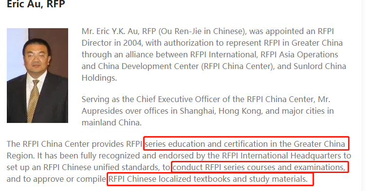 RFP学会官网(www.rfpi.com)在关于欧仁杰先生的介绍中,明确指出RFP中国经RFP学会批准,“在大中华地区开展RFP系列教育、认证,建立RFP的中文化标准并以此开展系列课程及考试,授权开发中国本土化的RFP教材和教学资料。”
