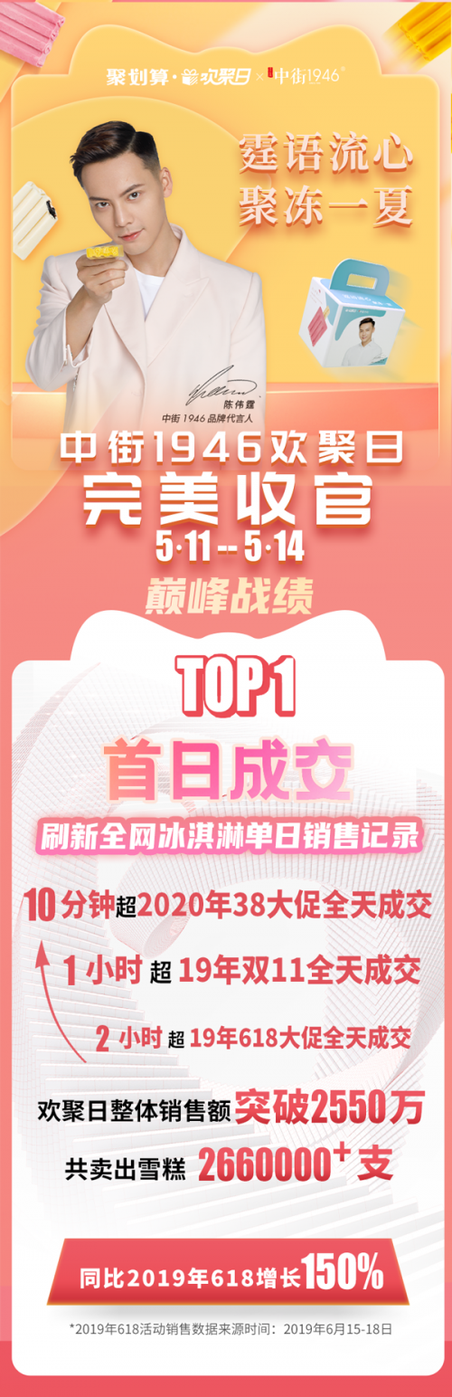 除了签约品牌代言人陈伟霆,品牌还牵手了聚划算欢聚日活动IP,5月11-14日做了一场盛大的品牌五周年庆活动!开卖短短2小时,全店销售额破1000万!超19年618大促全天成交!5月11日当天更是破2000万,刷新全网冰淇淋单日销售记录!连续4天,中街1946聚划算欢聚日活动爆卖2550万+!本次中街1946聚划算欢聚日活动的完美成功,更是离不开聚划算食品生鲜&淘宝吃货负责人旭宏、聚划算小二宏昭、欢聚日负责人七葆与莜尢的支持,砥砺同行共创佳绩!
