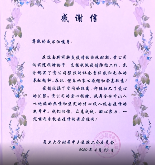 威尔仕为抗疫卫士捐赠健身季卡的举动,也收获到了来自于中山医院的感谢信。从感谢信的内容之中,就可以很好地看出中山医院对于威尔仕所做事情的肯定。