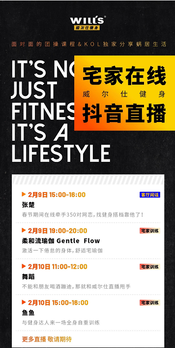 疫情期间,威尔仕开启了线上直播教学课程,其中有超过150多种独创特色团体课程和多样化训练方式,不断的为会员营造友好的家庭锻炼氛围与健康的美好生活。