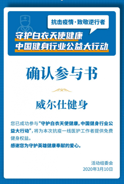 威尔仕始终默默的用自己的实际行动,践行着对社会的承诺,用自己的力量守护着医护人员,为他们的平安归来而期盼着。而且在2020年3月时,威尔仕就特别支持了“守护白衣天使健康”中国健身行业公益行动,并为其赠送了总价值百万余元的关爱年卡。