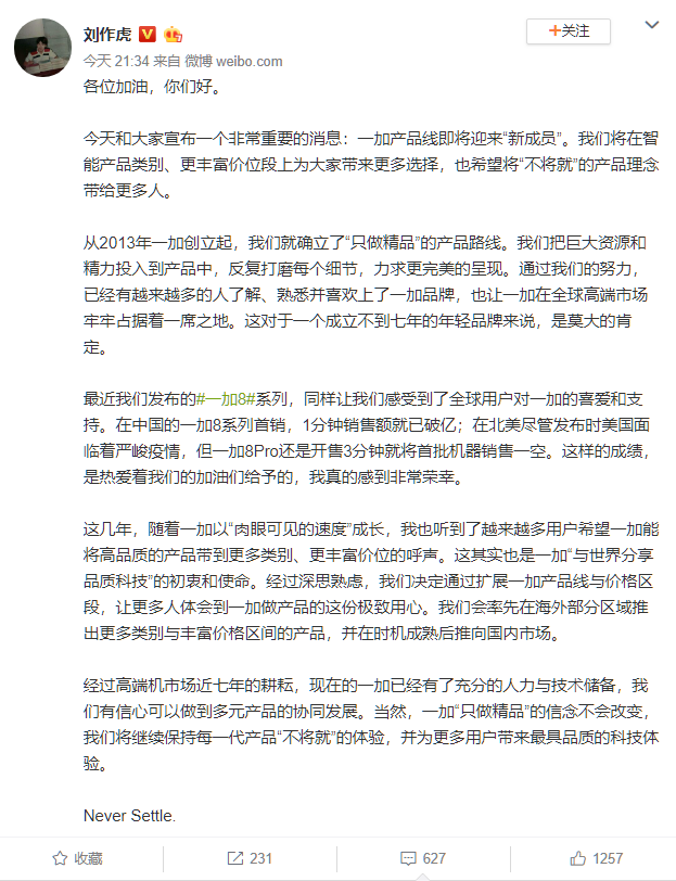 5月26日晚,一加CEO兼创始人刘作虎通过微博宣布,未来一加将会扩充新的产品线,同时推出更多不同价位段的产品。