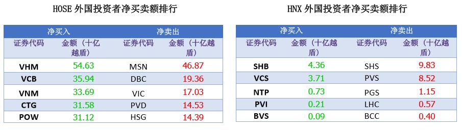 外资今日净卖出近700万股,但整体市场上却净买入约200亿越盾。买盘集中于蓝筹股:VHM(546.3亿越盾),VCB(359.4亿越盾),VNM(336.9亿越盾),CTG(316亿越盾)。相反,MSN是外资净卖出最多的股票,净卖出总额为468.7亿越盾。