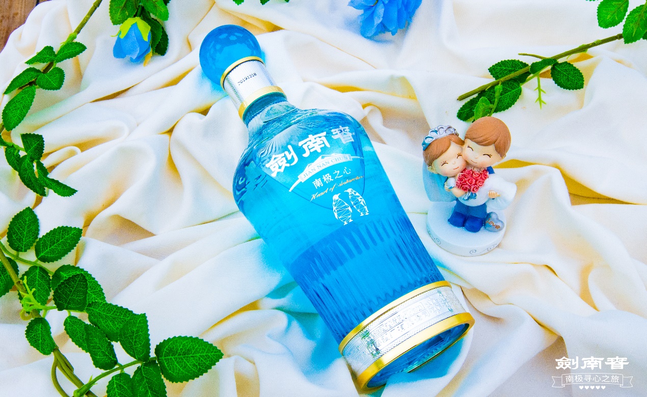 我们在剑南春的官方旗舰店看到,南极之心不同于剑南春其他系列的产品,这款产品以南极冰川蓝作为主色调,将浮冰、雪花、企鹅等元素巧妙地组合在一起,外形设计更显独特与珍稀,被赋予了纯净与永恒的寓意。这样的设计不仅更贴近年轻人的喜好,也借此表达了对美好爱情的致敬,以及对每一对新人的美好祝福,可见剑南春的独特用心。