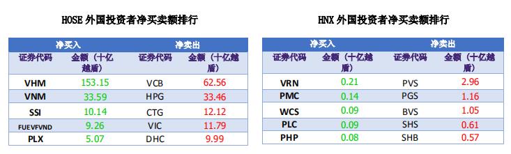 外资连续第二个交易日净买入,两市净买入总额达200亿越南盾。其中,买盘集中于VHM(1524亿越南盾),VNM(335亿越南盾),SSI(100亿越南盾)。相反,净卖出最多的股票包括VCB( -626亿越南盾),HPG(-335亿越南盾)。