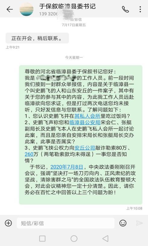 (以上图片为史鹏飞发给尚邦公司的短信及编辑部人员发给临漳县委于书记的短信)