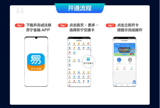 那么,怎么免费开通金陵通NFC交通卡?上苏宁金融APP搜索“交通卡”,或者在APP内首页点击“更多”,选择“苏宁交通卡”,再点击“立即开卡”,按提示完成操作,就大功告成了。