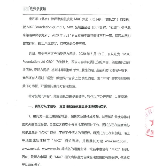 泰和泰律师事务所一份非公开律函文件显示:2020年5月19日,在认证为“MXC Ltd CEO”的微博上,发表内容涉及委托方的声明,以“碰瓷”手段求上位;该“声明”贬损了委托方商誉、严重侵犯委托方合法权益。