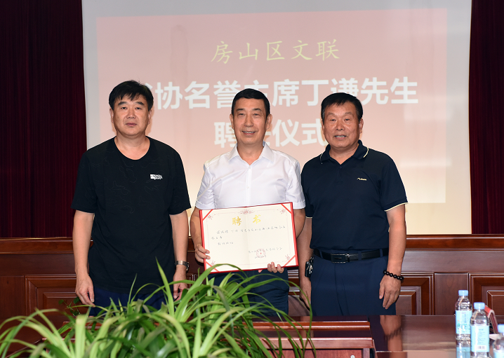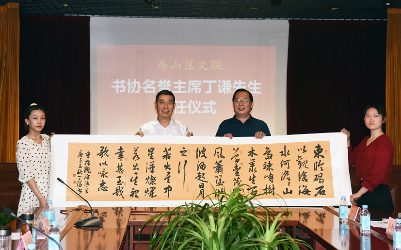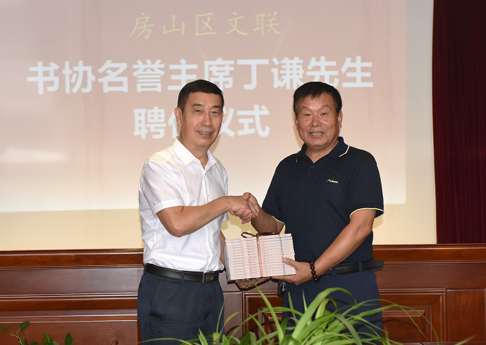 房山区文联名誉主席柳铁良、书协主席侯振海向丁谦先生颁发了书协名誉主席聘书