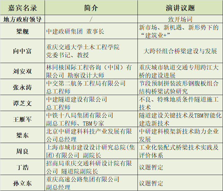 为推动国内桥梁与隧道建设技术的蓬勃发展,切实提升建筑施工企业桥梁、隧道项目的建设能力,加快国内桥隧领域新技术、新工艺、新装备的普及与应用,促进我国桥隧基础设施产业实现高质量转型升级,中建政研信息咨询中心联合重庆市桥梁协会于10月29-31日在重庆市举办第三届全国桥梁与隧道技术交流高峰论坛暨“白居寺长江大桥项目”考察观摩。
