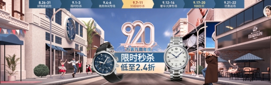 8月26日,以万表名表商城为主阵地的万表9周年庆活动正式启动。此次万表9周年庆一共分为7大会场,在经过好物提前抢、限时秒杀、商务休闲专场的满减、直降优惠轰炸及宣传造势后,万表名表商城售表销量大幅度增长,吸引不少表迷进入万表名表商城挑选名表。