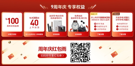 除此之外,万表9周年庆期间可享9大购表权益:100元周年庆现金券、每满300减40上不封顶、购表送表带\电动牙刷、免费抽奖赢浪琴手包\旅行包、二手部分品牌折上每满10000减200、维修保养低至85折。同时为配合周年庆氛围,万表名表商城周年庆会场还有周年庆红包雨活动。