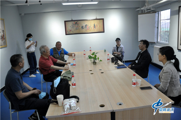 北京市西城文联常务副主席台峰(右侧中)在讲座开始前与西城美协主席纪清远(左侧中)等座谈