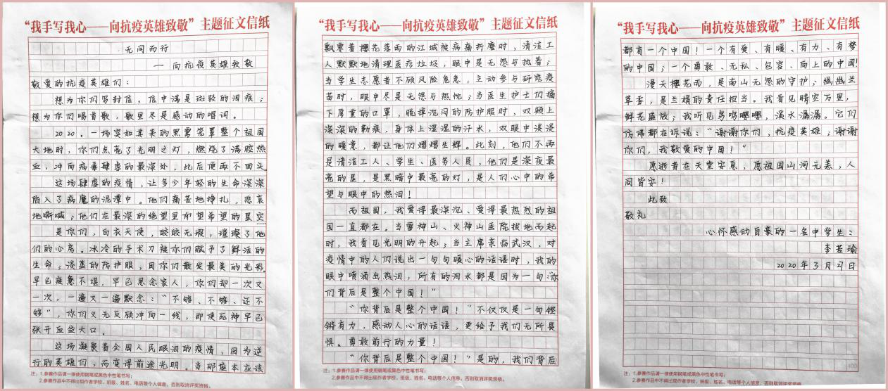 从10月1日起,主办方将开启公众投票通道,可前往“感谢、感恩、感动” 2020年书信中国文化传播活动官网进行投票(https://vote6.gmw.cn/photo-list.html?collection_id=131&weixin_id=),投票时间截止至10月23日。这些致敬逆行天使的书信,你最心仪哪一款?请投出你宝贵的一票。