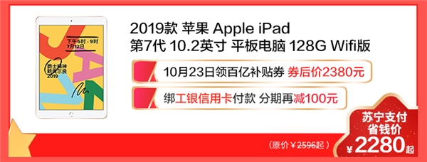 10月23日,在苏宁易购商城购2019款 苹果 Apple iPad 第7代 10.2英寸平板电脑 128G,用苏宁支付绑定工行信用卡付款,在券后价2380元的基础上分期再减100元。