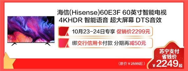 10月23日至24日,在苏宁易购商城购海信60英寸超薄彩电,用苏宁支付绑定交行信用卡付款,在促销价2299元的基础上分期再减50元。