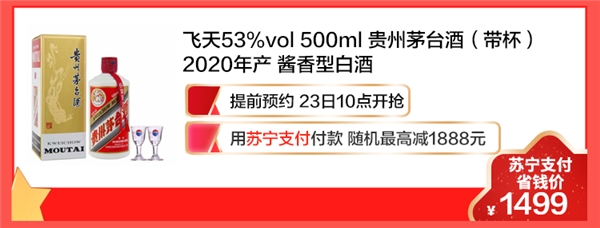 10月23日10点,在苏宁易购商城开抢飞天茅台,用苏宁支付付款,随机最高减1888元。