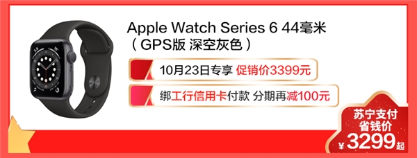 10月23日,在苏宁易购商城购Apple Watch Series 6,用苏宁支付绑定工行信用卡付款,在促销价3399元的基础上分期再减100元。