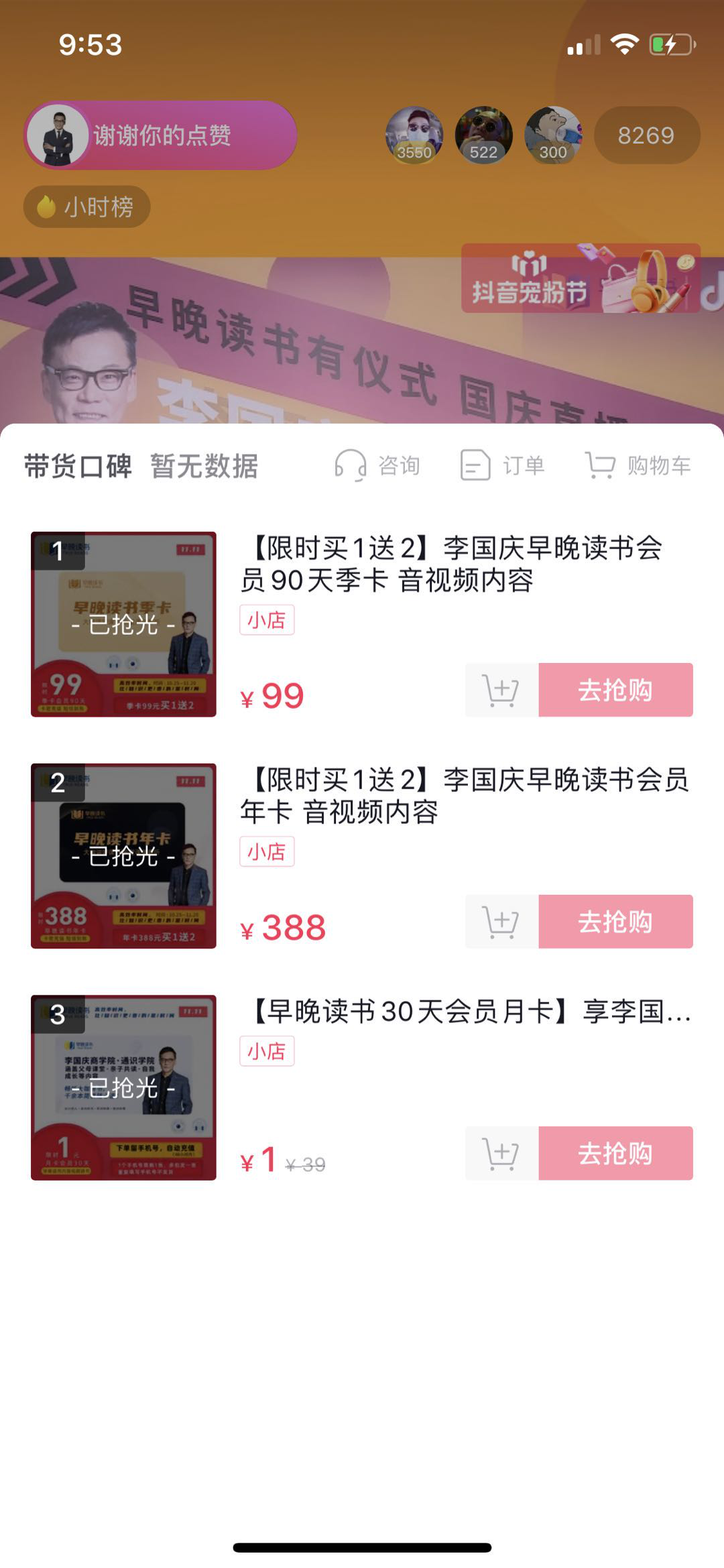 在刚刚过去的抖音直播带货首秀上,李国庆也没有忘记对好书的推荐,例如《麦肯锡工作法》、《闪电式扩张》等。值得一提的是,李国庆对文化的宣扬,也得到了广大直播间观众们的认可。在直播期间,抖音小店中早晚读书的月卡、季卡、年卡全部热销抢空。