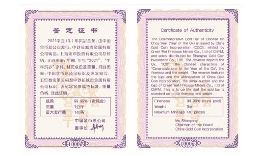 2021年是辛丑(牛)年,为迎接牛年新春,传承民族经典、弘扬民俗文化,中国金币总公司于2020年11月18日发行了2021辛丑(牛)年贺岁金条。金条共有1000克、500克、200克、100克、50克和30克6个规格,成色均为99.99%,最大发行量分别为140条、400条、1500条、11900条、18000条和9000条,最大发行总重量为3000公斤。