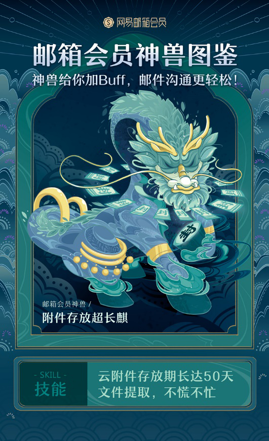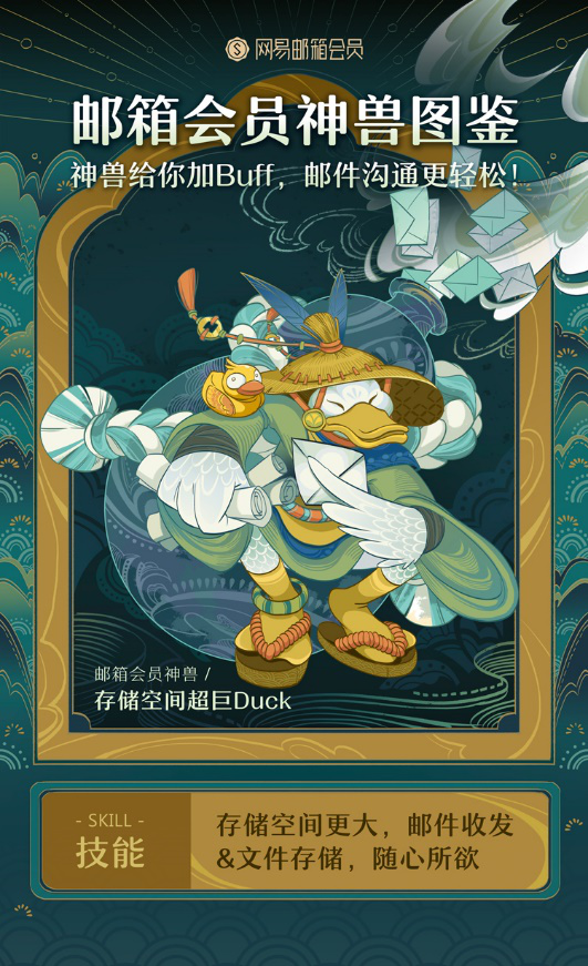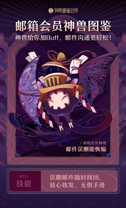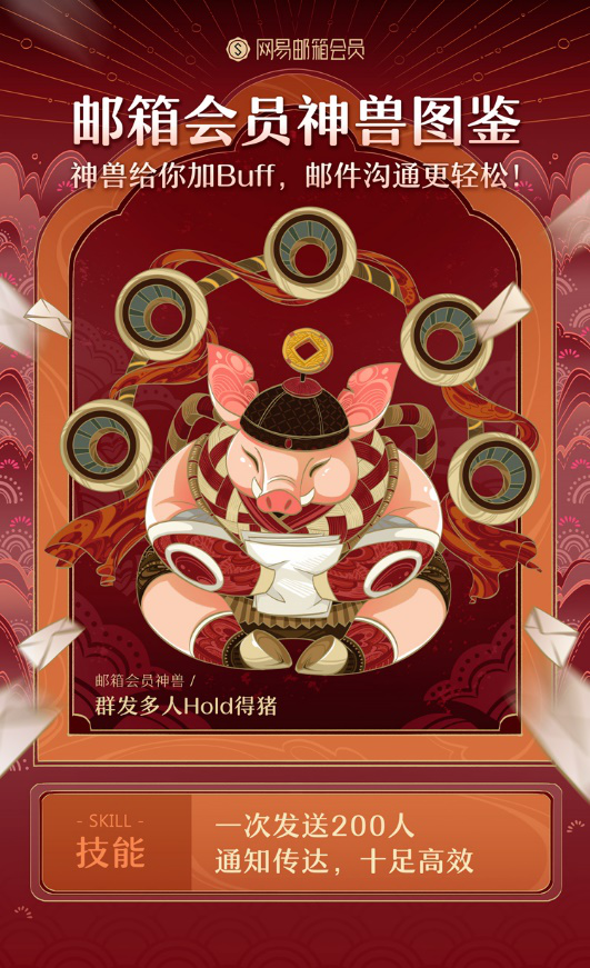 为了方便用户更快联想到会员“特权”,网易邮箱专门推出了一组“邮箱会员神兽图鉴”。其中,包含“群发多人hold得猪”,示意会员可以获得最多一次性群发200人次的权益;“邮件误删能恢蝠”,示意会员可享用邮件误删恢复的服务;“广告全被屏蔽鸟”,示意会员可以享受免广告权益;“附件存放超长麒”,示意会员可以享受云附件存储50天;“存储空间超巨duck”则是示意会员可以享受更大的存储空间……