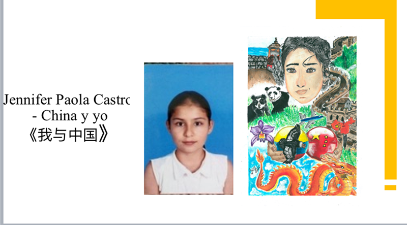 哥国家教育培训中心主任埃斯特拉纳,对青年组一等奖詹妮弗的《我与中国》(JenniferPaolaCastro-Chinayyo)赞不绝口,他说:小画家巧妙地将长城、灯塔、巨龙,熊猫,安第斯山鹰、哥伦比亚古城堡、眼镜熊、兰花等一组组中哥文化符号均衡的描绘在画面里,布局有序,相互对称,特别是画面中代表作者本人的小女孩怀抱绘有中哥两国国旗装饰的足球,似乎在祝福着上海绿地申花足球队队长、哥伦比亚籍球员莫雷诺率队在卡塔尔参加亚洲冠军联赛取得好成绩。整个画面将中哥日益深厚的文化、非遗、旅游、体育交流尽情展现,凸显中哥友谊的牢固与长久。