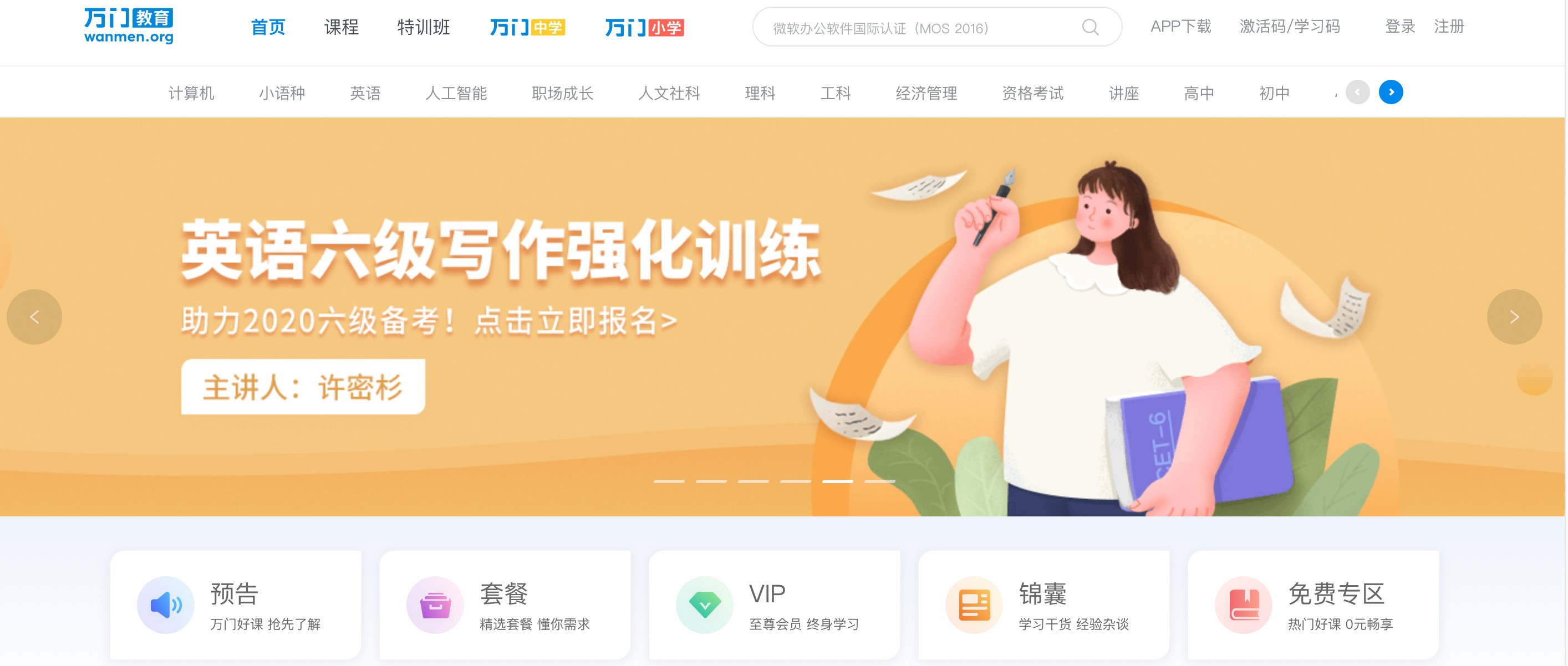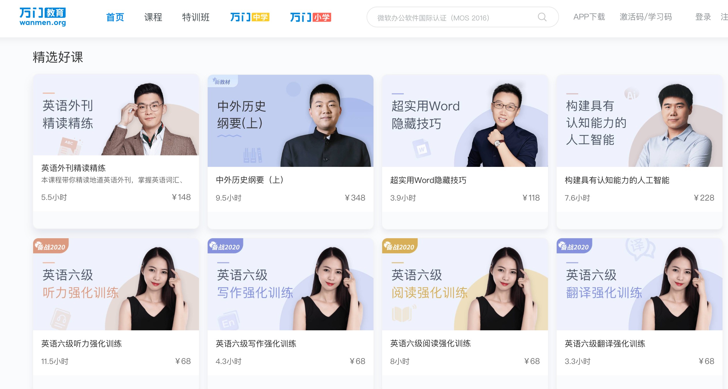 随着教育信息化2.0的普及,我国教育体系发生了较明显的变化。人工智能、大数据、云计算等高科技的出现,刺激了数字信息化教育的发展。万门大学成立于2012年,是最早一批在线教育企业之一。万门大学是一个提供多品类原创音视频在线课程的平台,课程覆盖面达:大学类、职场应用类、中小学类、计算机类、语言类等多领域。万门大学始终坚持“原创课程、精细讲解”的制作标准,以课程质量为生命线,邀请一线老师授课,为千万的学习者提供了高品质的课程。课程质量是万门教育的立命之基,平台内所有课程都受长期钻研,精心打磨,再经过从新课立项到课程迭代共7个环节,才最终推出上架。