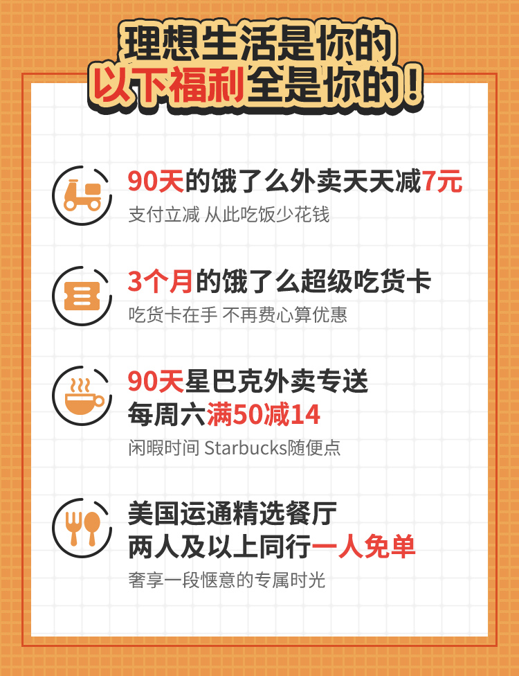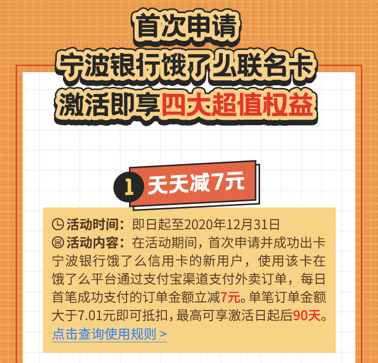 新用户在2020年12月31日前成功办出这张卡,可以享受90天饿了么每天减7元的权益。