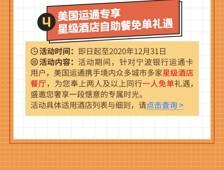 最后!还没完!必须要墙裂安利宁波银行近期推出的年夜饭活动,只针对运通信用卡客户,支付宝或微信每消费10元可得1元年夜饭基金,最高可得5000元的年夜饭基金,相当于消费返现10%啊!而且就是简单粗暴的消费消费,没有烧脑的套路,宁波银行这个态度深得我心!感兴趣的朋友也可以关注一下,他们家的微信公众号“宁波银行信用卡”,最新的热门活动都会有推送。