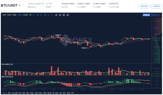 据OKEx数据显示,截至12月10日下午17:00,比特币现报18431.9美元,24小时涨幅为2.11%。