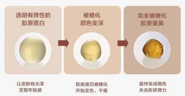 糖化本身并不可怕,但是糖化反应的终产物——晚期糖化终产物(AGEs),这确实是对人体是有害的,所以“抗糖化”,抗的其实就是AGEs,它在皮肤中主要的攻击目标,就是胶原蛋白!它们让胶原蛋白发生交联和功能障碍,从而使得皮肤松弛、有细纹!