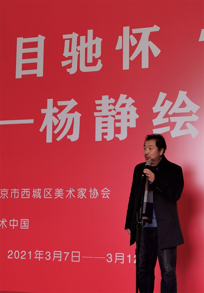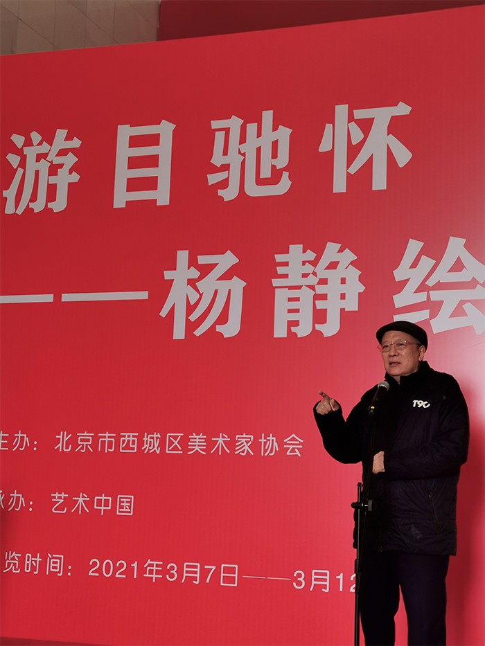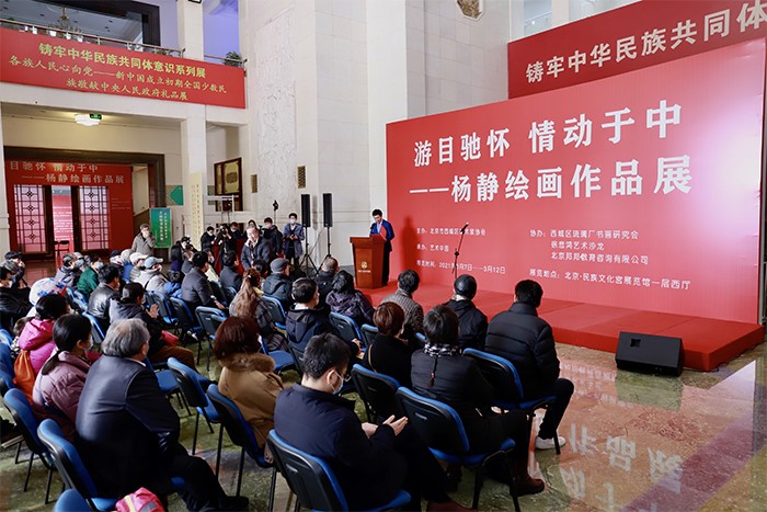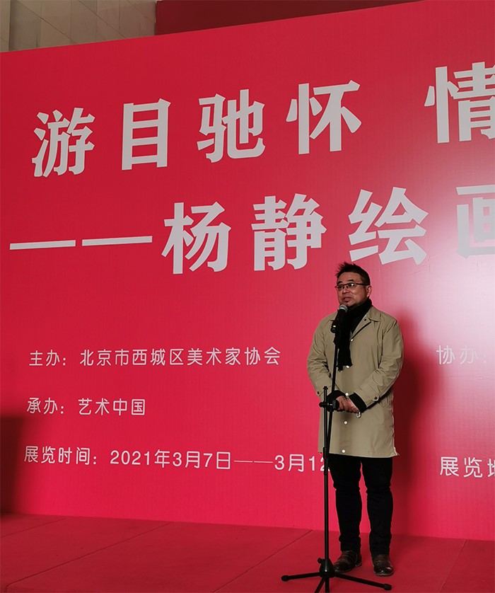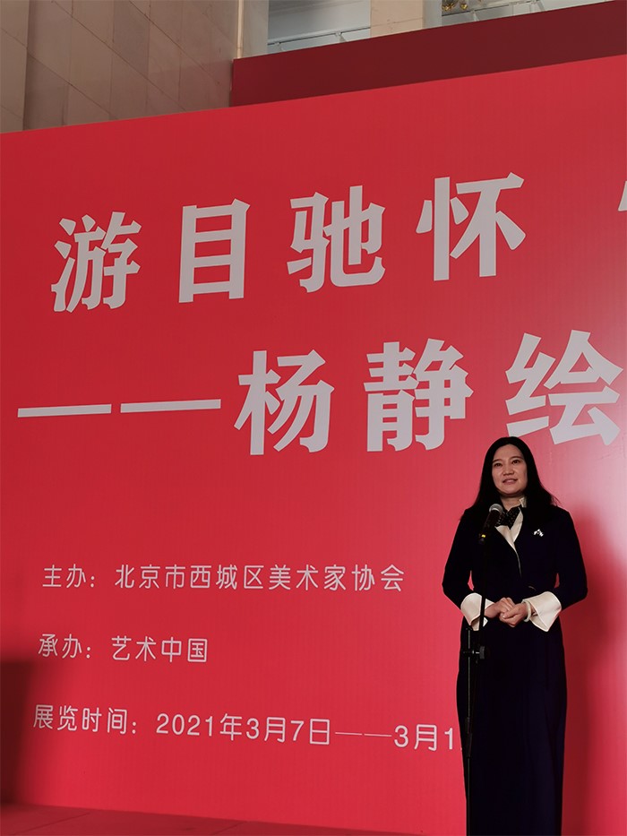 2021年3月7日,由北京市西城区美术家协会主办、艺术中国承办的“游目驰怀 情动于中——杨静绘画作品展”在北京•民族文化宫展览馆举行开幕式。今年是中国共产党成立100周年,也是“十四五”的开局之年,中国人民在中国共产党领导下走入新时代。党的十九届五中全会审议通过的《中共中央关于制定国民经济和社会发展第十四个五年规划和二〇三五年远景目标的建议》提出:“实施文艺作品质量提升工程,加强现实题材创作生产,不断推出反映时代新气象、讴歌人民新创造的文艺精品。”为新时代文艺创作工作高质量发展提出了新的更高要求。