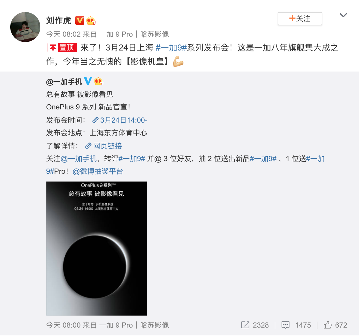 3月9日,一加手机正式宣布将于3月24日在上海举行主题为“总有故事被影像看见”的新品发布会。一加CEO兼创始人刘作虎通过微博表示:“这是一加八年旗舰集大成之作,今年当之无愧的影像机皇。”