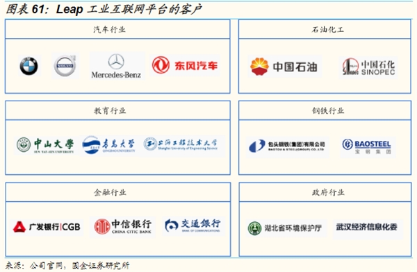 以Leap工业互联网为例,Leap平台帮助企业实现各环节数据采集、分析和融合,降低企业使用门槛,助力行业智能解决方案的落地。平台已经实现在智慧城市、智慧教育、智慧能源等领域的应用,并与包括宝马、中石油等国内外知名客户合作。
