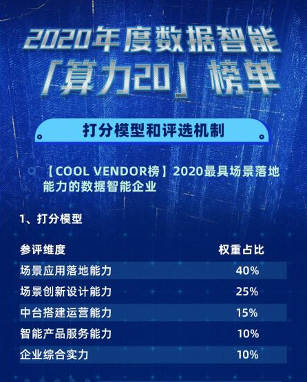 作为由多方专业机构认定、业内具有主流影响力和广泛参考意义的智能权威榜单,「算力20」Cool Vendor奖项吸引了大量已进入技术商用阶段,将数据智能技术运用融合至商业场景中,并产生了实际的应用落地案例,且业务中台已经搭建相对成熟的大中型企业申报参选。
