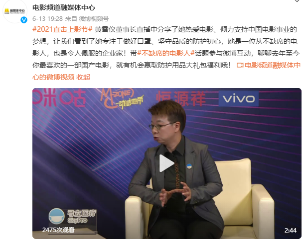 6月12日下午,“2021年直击电影节”于微博“电影频道”进行现场直播,弓立医疗黄雪仪女士出现在直播现场,同主持人进行亲切深入的交谈,讲述了自己曾经的一段电影经历和电影梦,也分享了个人在事业上的感悟与心得。