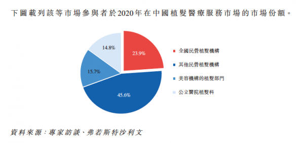 根据弗若斯特沙利文的数据,在中国所有毛发医疗服务提供商中,雍禾医疗2020年的总收入、于2020年末的注册医生人数、于2020年末的运营中医疗机构数量,以及2020年的就诊植发患者人数,排名第一。同样根据弗若斯特沙利文的数据,雍禾医疗在中国50个城市经营51家医疗机构,是中国最大及覆盖面最广的连锁植发医疗机构。
