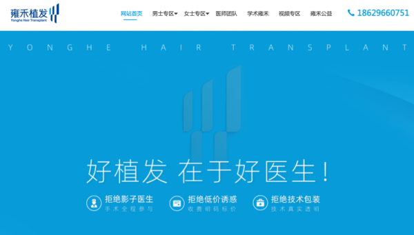 在雍禾官网上,“三透明保证”被放在最显眼的位置:拒绝“影子医生”,确保医生手术人证合一、全程参与;拒绝非法行医,医生资质现场查验;拒绝过度医疗,医生术前术中坚持医疗透明化,对症施治、明码标价,绝不过度提取毛囊,绝不小病大医。支持医生资质现场查验,切实保障患者权益放心植发。