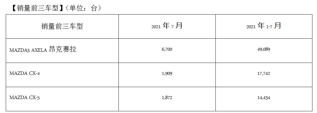此外,1-7月的累计销量为110,362台。其中,一汽马自达销量为36,466台,长安马自达销量为73,896台。
