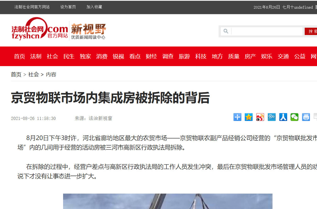 8月20日下午3时许,河北省廊坊地区最大的农贸市场——京贸物联农副产品经销公司经营的“京贸物联批发市场”内的几间用于经营的活动房被三河市高新区行政执法局拆除。