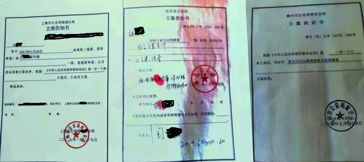 2021年1月29日,上海市公安局某分局作出《立案告知书》。6月24日,南昌县公安局也作出《立案告知书》。