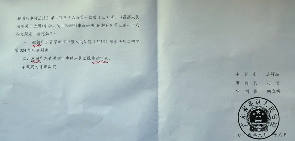 省高院认为,原判认定事实不清、证据不足于2019年8月28日,依照《刑法》第236条第一款第(三)项,《最高人民法院关于适用<中华人民共和国刑事诉讼法>的解释》第318条之规定,作出(2018)粤刑终658号刑事裁定,撤销了(2015)深中法刑二初字第324号刑事判决,将案件发回深圳中院重新审理。