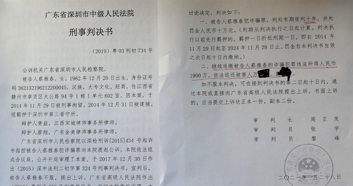 2017年12月30日,深圳中院作出(2015)深中法刑二初字第324号刑事判决:被告人蔡雅春犯诈骗罪,判处有期徒刑10年,并处罚金人民币10万元,继续追缴被告人蔡雅春的诈骗犯罪违法所得人民币1900万元,依法返还万某宏、魏某勇。