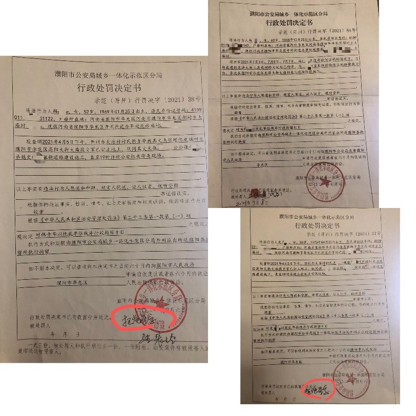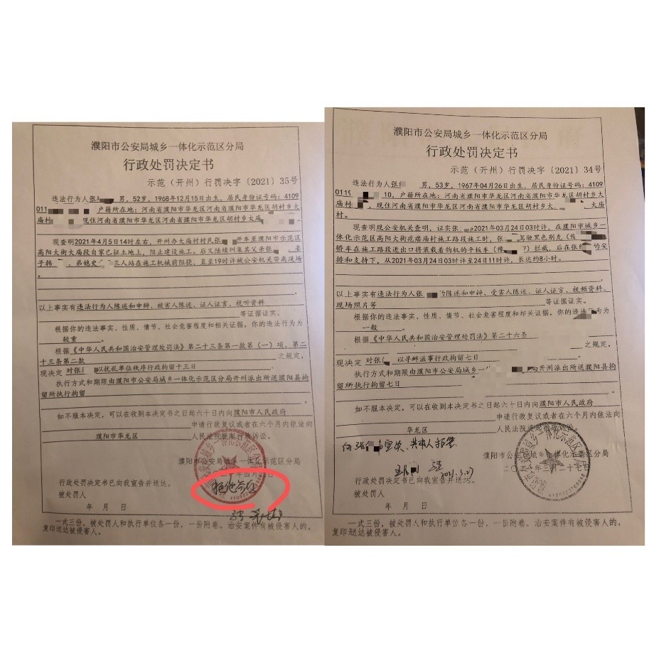 “被逼上楼”的过程伴随着威胁恐吓与血腥暴力。据不完全统计,仅2021年4月就有多位村民(张红某、张增某、史某平及韩某华)因为保家护地行为被当地派出所以“扰乱单位秩序”、“寻衅滋事”等名义行政拘留一到两周不等。