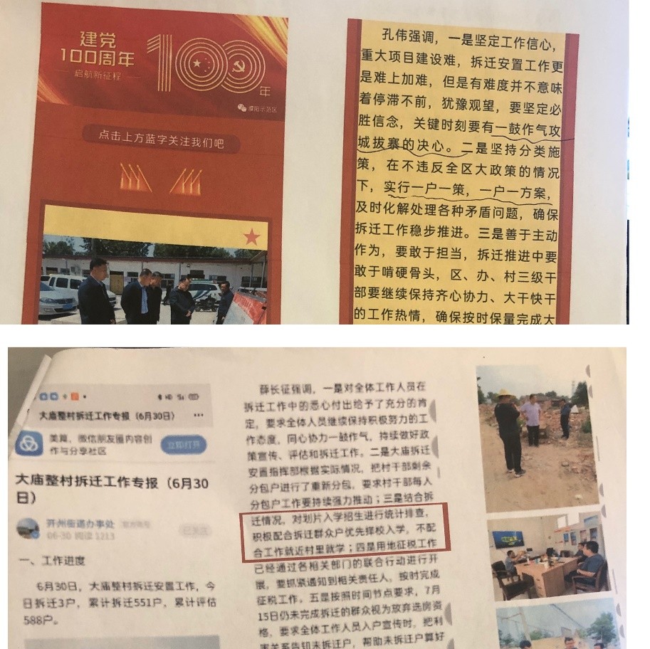 据了解,大庙村及孟村在近两年的征地拆迁还处处充斥着动用各种关系劝退上班族、威胁家长如果不配合就不允许孩子上好学校等各种软暴力及断电断水断气等各种践踏民生的粗暴行径,极大地影响了两村村民的正常生活。