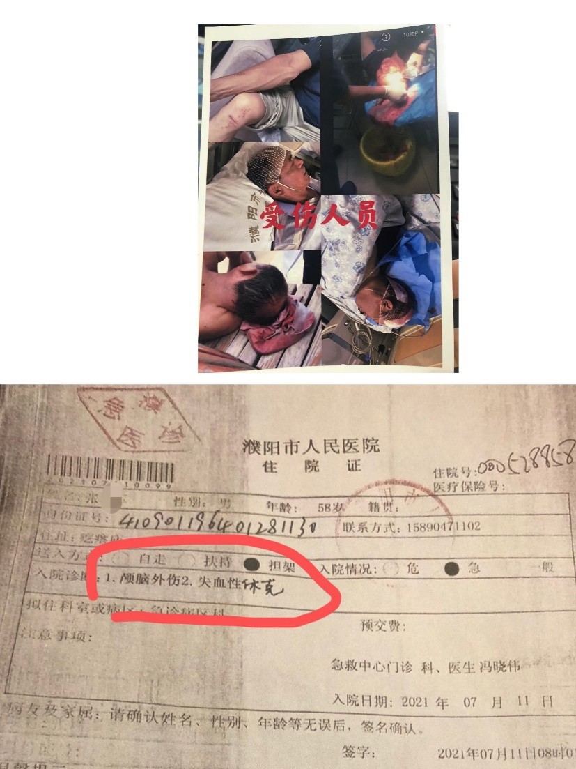 就在7月11日当日,大庙村村民张某军被数名强拆人员用砖头殴打致昏迷。后被家人送到公安医院拍了头颅脑部CT后转至濮阳市人民医院进行抢救。由于伤势严重失血过多,张某军被诊断为颅脑外伤及失血性休克,住院25天,经法医鉴定为轻微伤。从当日07:47报警至今,董某兵团伙施暴者依然逍遥法外。