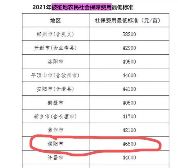 2021年7月6日,河南省人力资源和社会保障厅印发《关于公布2021年被征地农民社会保障费用最低标准的通知》自2021年7月1日起执行。《通知》提出,各省辖市、济源示范区、各省直管县(市)可结合实际适当提高当地社会保障费用标准,报省人力资源和社会保障厅备案后生效。在当地确定的社会保障费用标准生效前,按此次公布的最低标准执行。其中,濮阳市的标准是46500元。