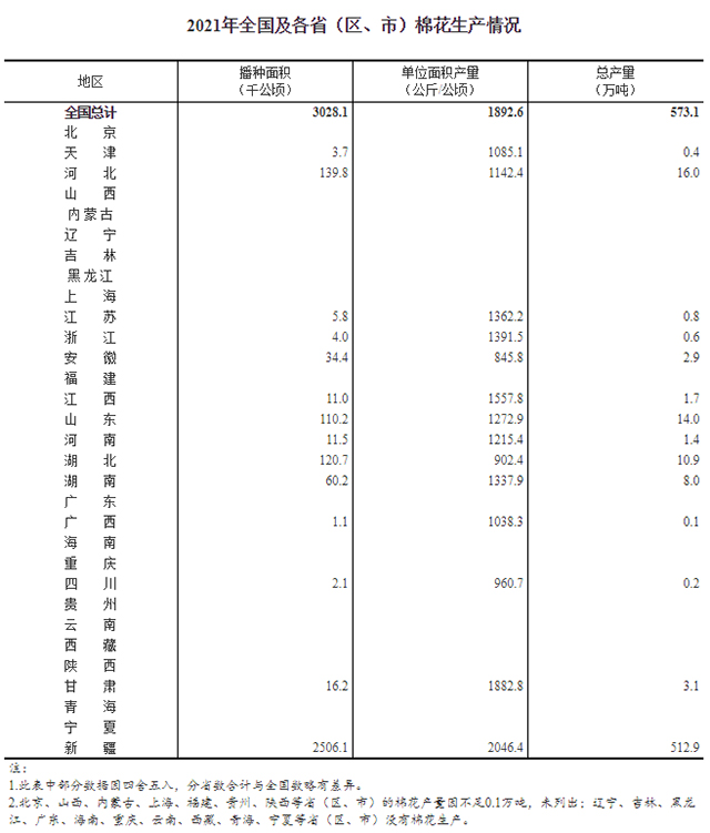 全国棉花总产量为31个省(区、市)棉花产量的总和。
