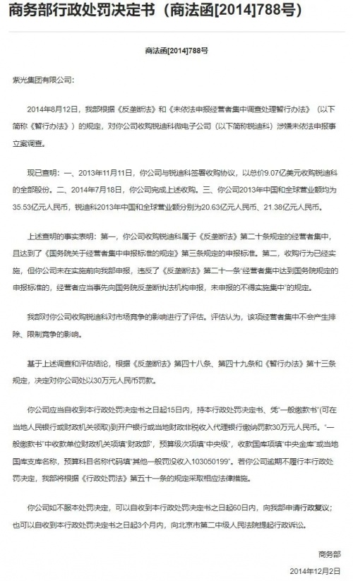 商务部对紫光集团的行政处罚书